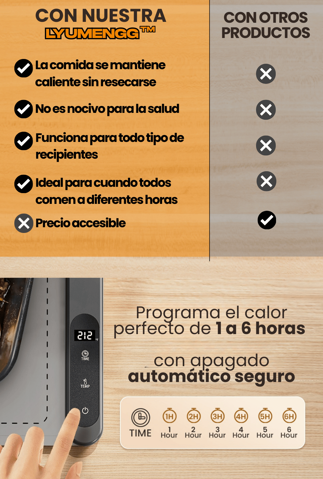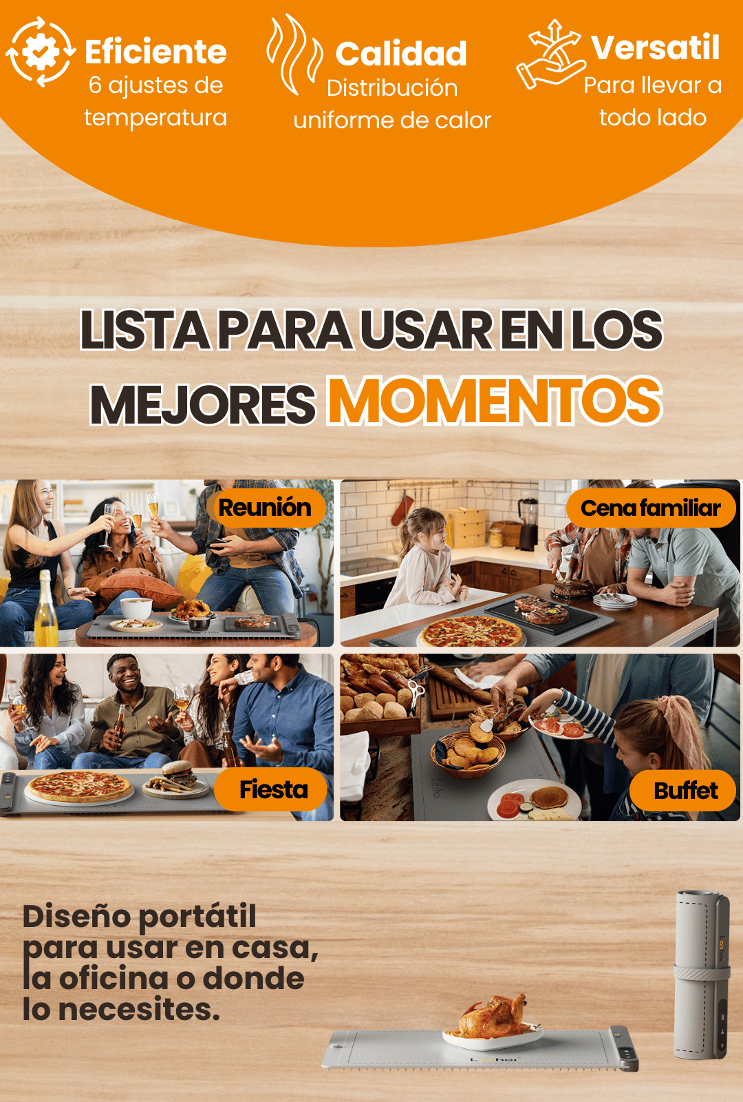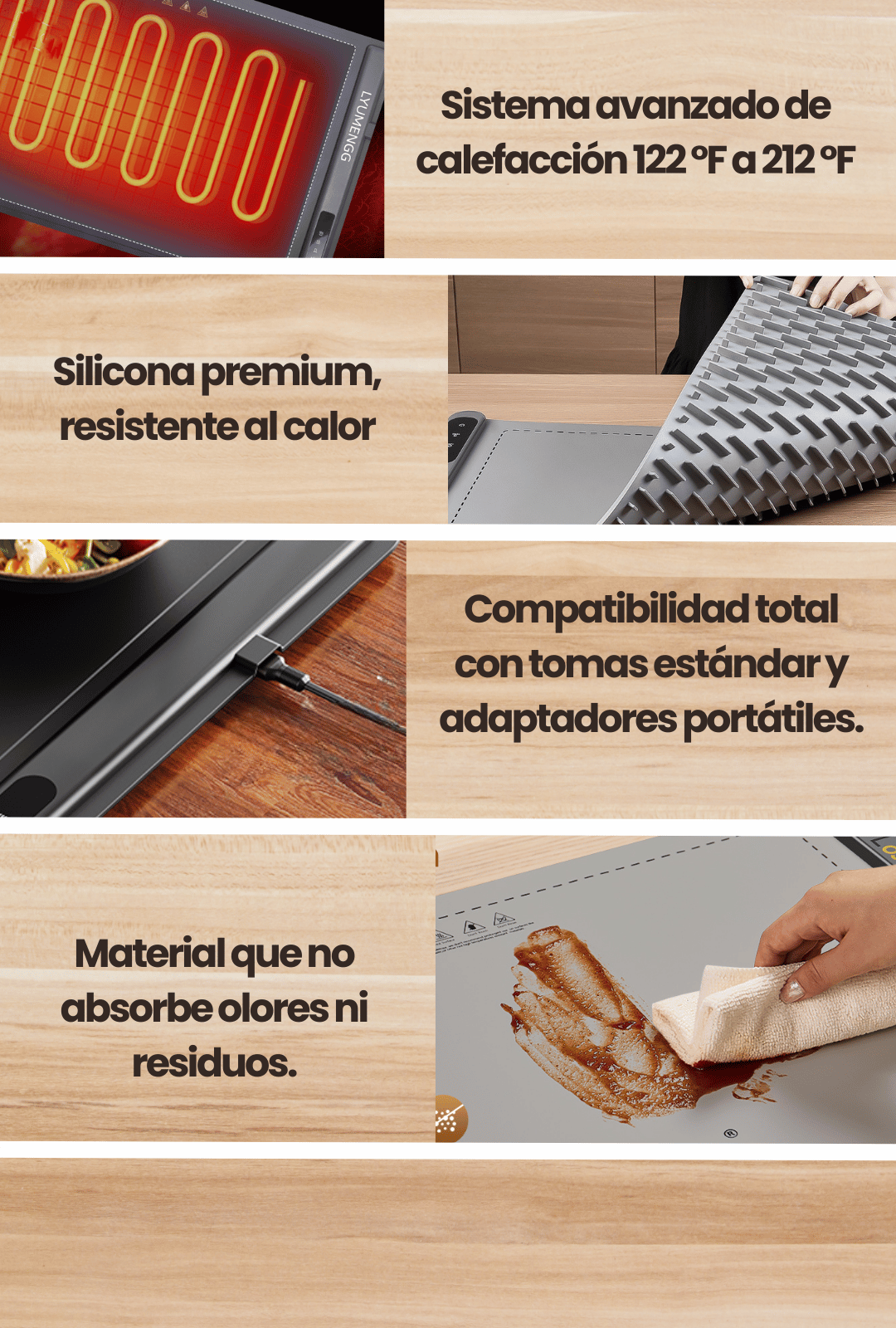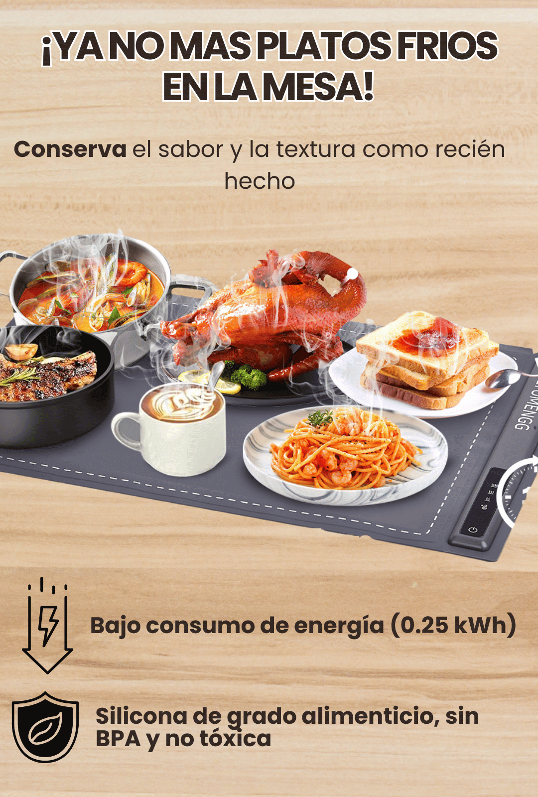 El tapete tiene 6 niveles de temperatura y puede mantener los alimentos calientes durante horas, sin secarlos ni quemarlos.