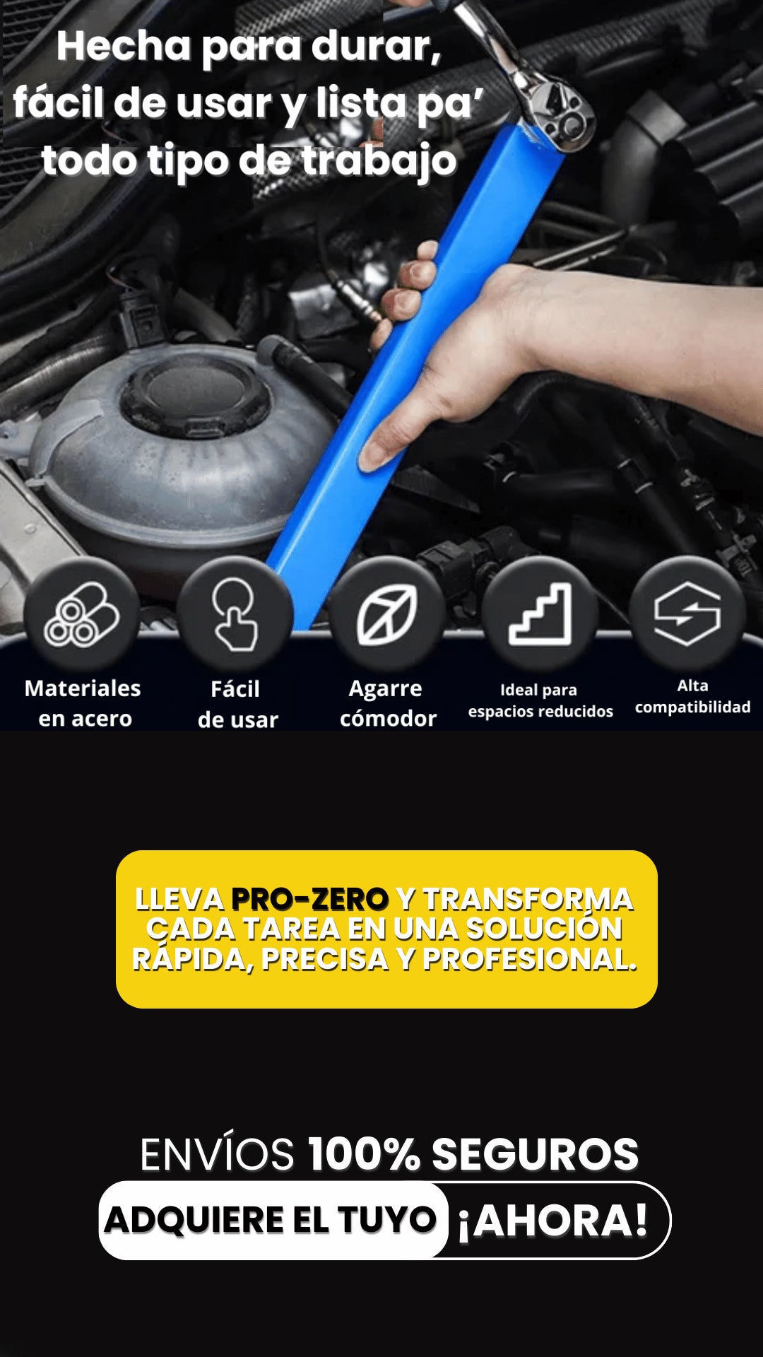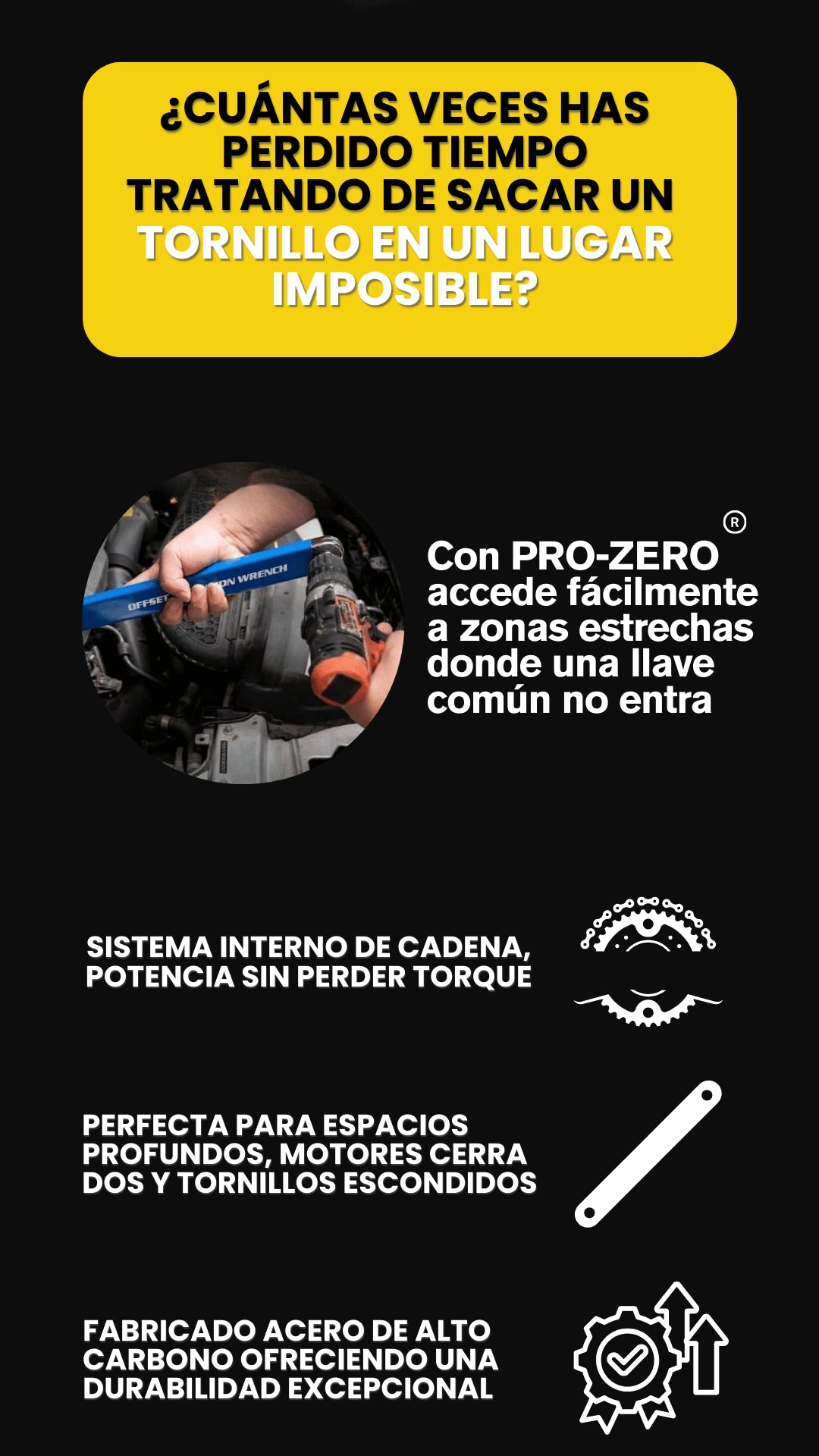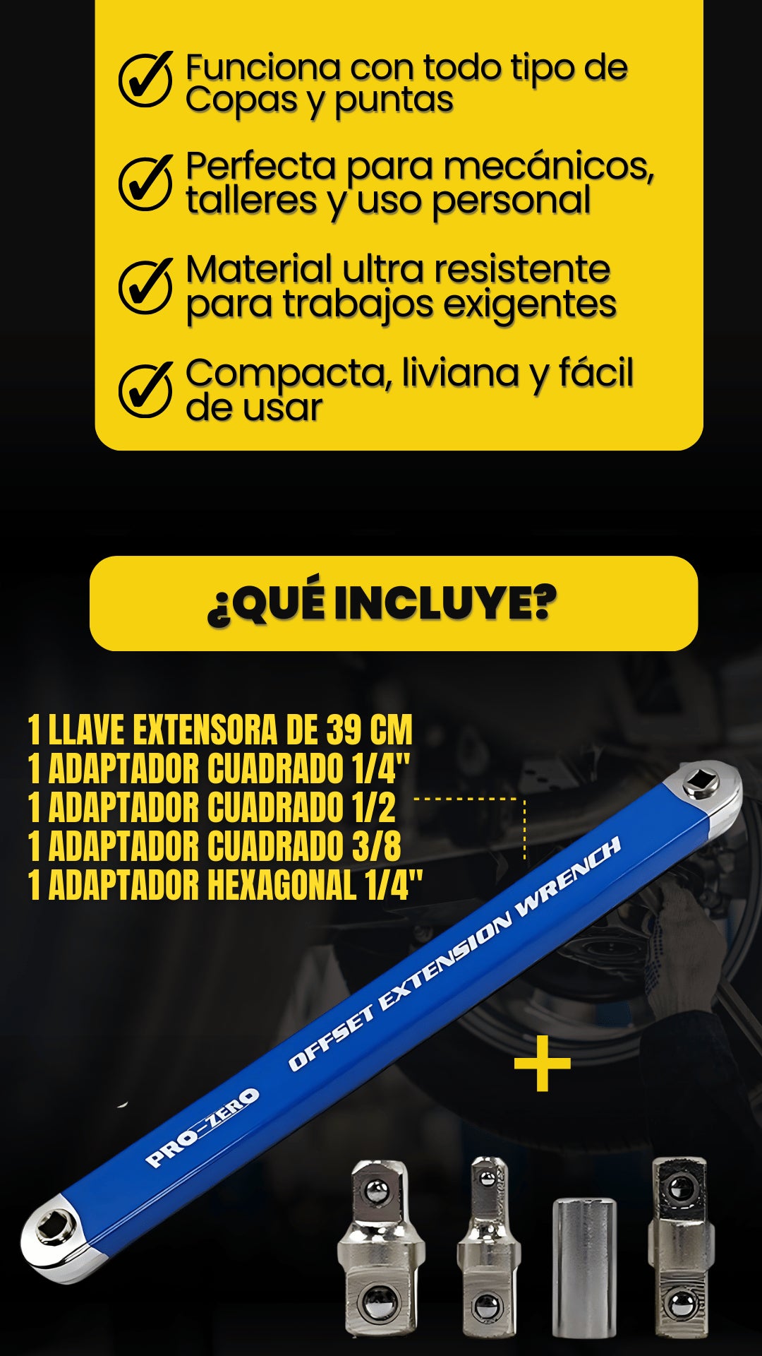 Incluye la llave extensora PRO-ZERO y 4 adaptadores (1/4", 3/8", 1/2", y 1/4" para taladro), listos para usar con cualquier herramienta.
