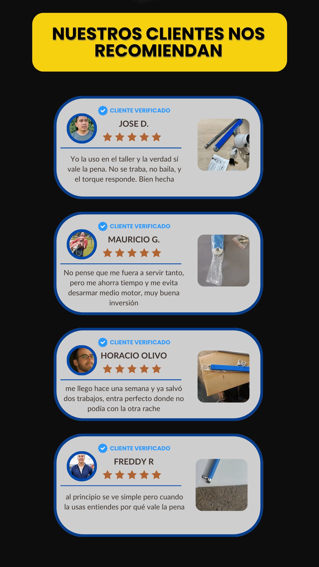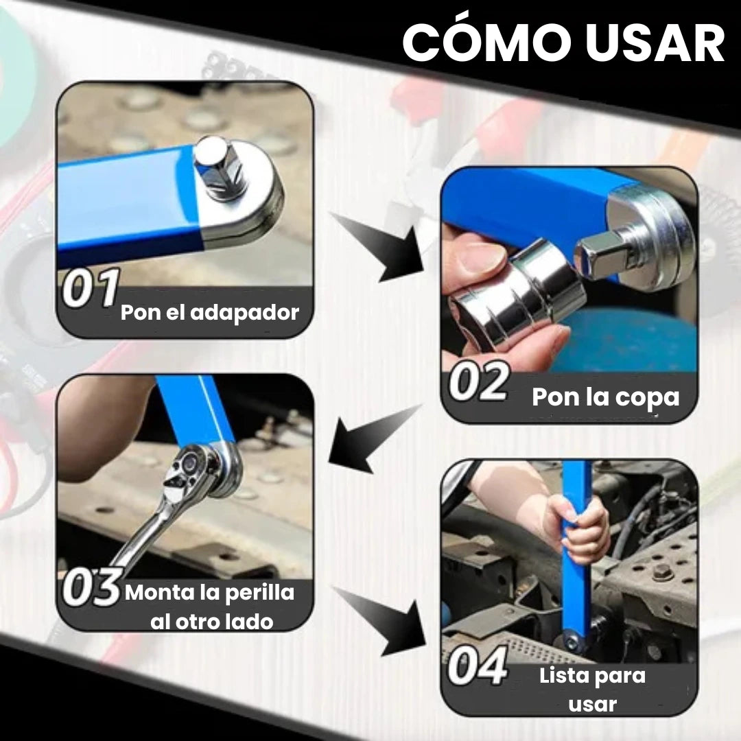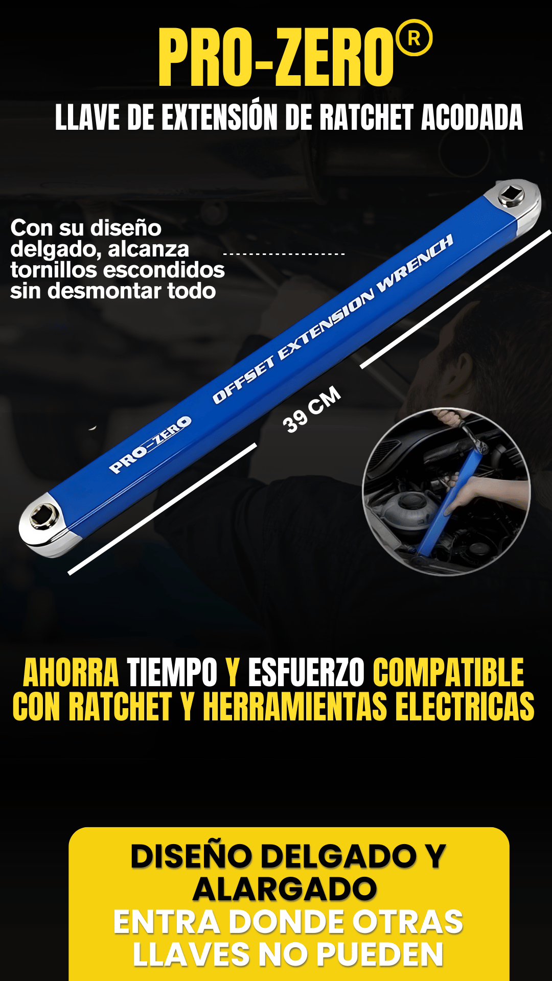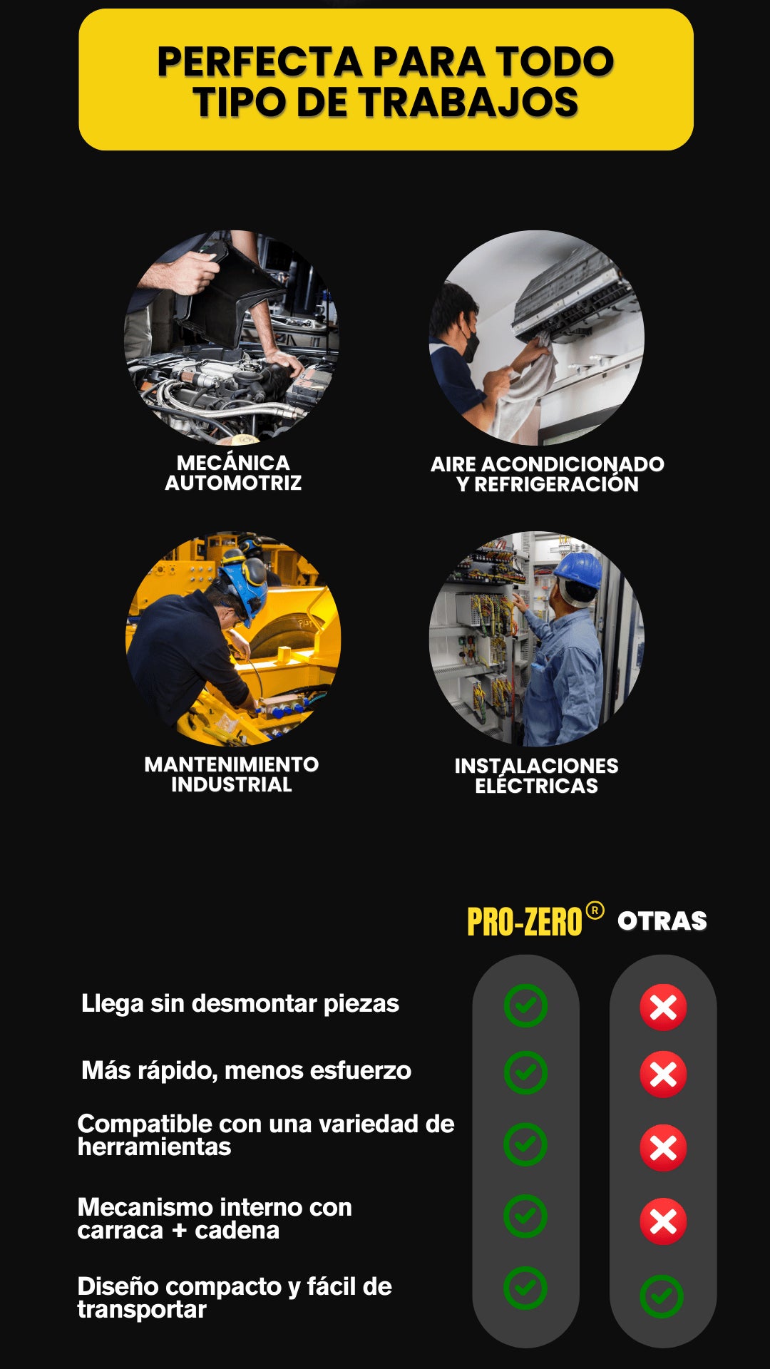 Incluye la llave extensora PRO-ZERO y 4 adaptadores (1/4", 3/8", 1/2", y 1/4" para taladro), listos para usar con cualquier herramienta.